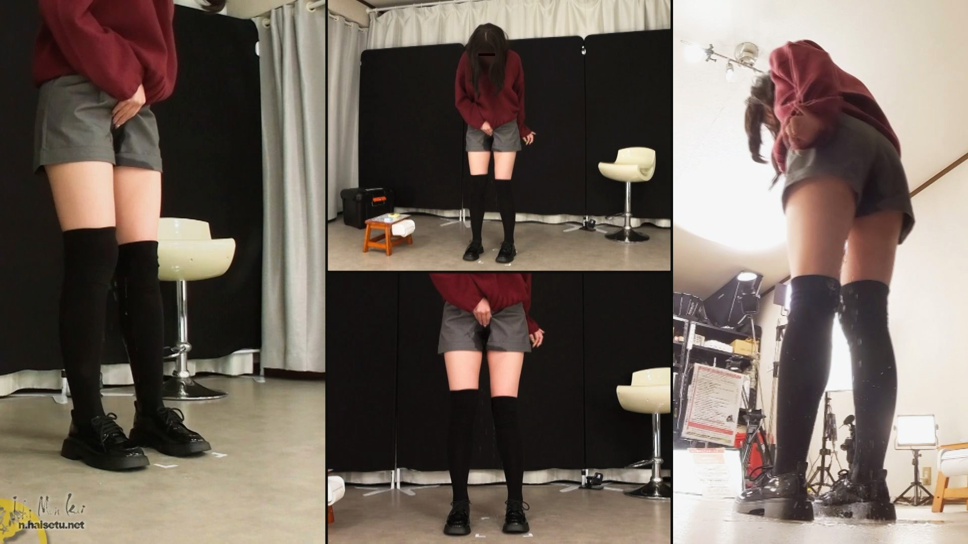 A video of a pee-holding game. The girls have to hold their pee for 20 minutes. If they can hold it, they get an extra 12 minutes. Potty dancing and wetting.